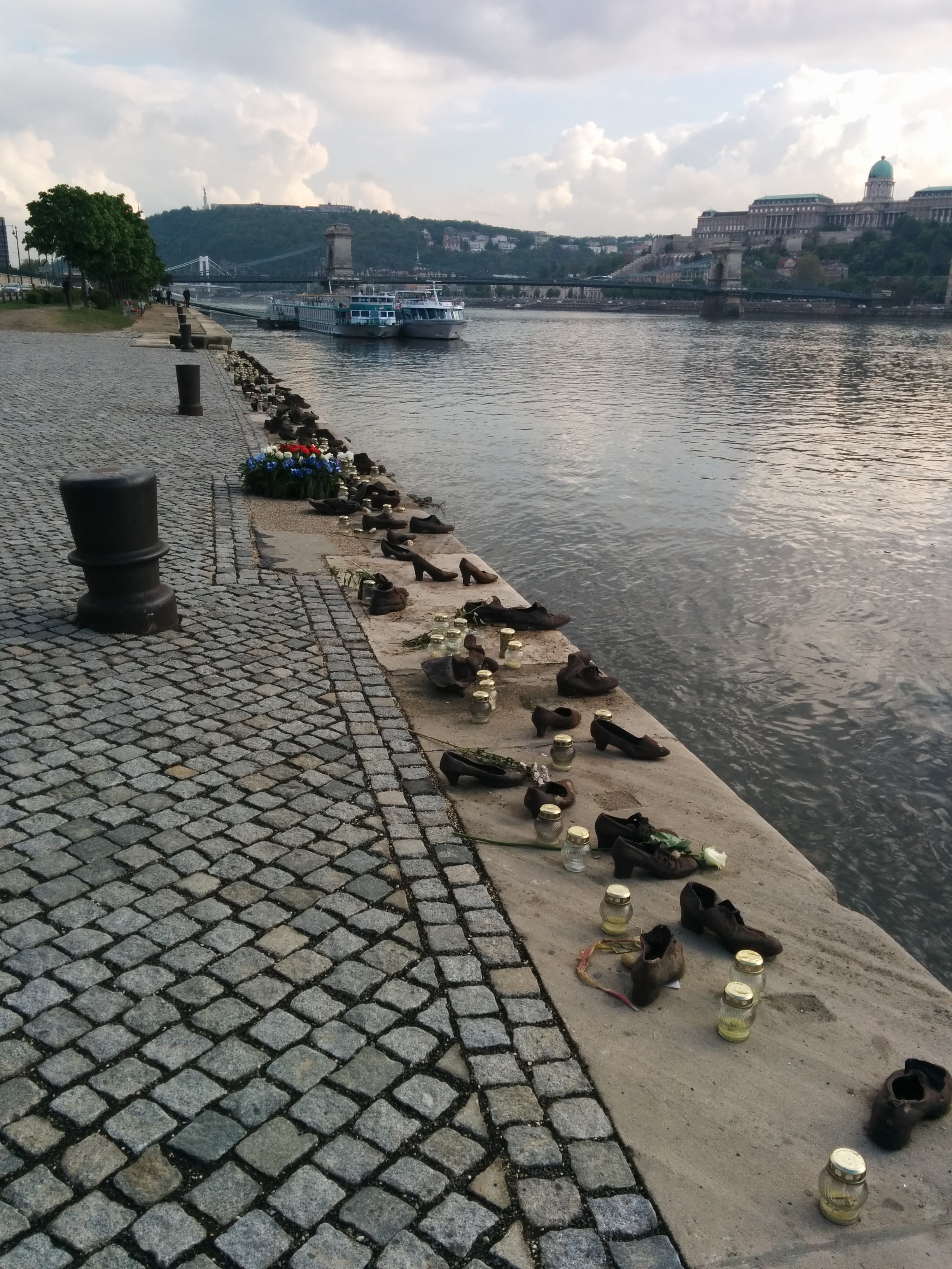 Antes de entrar en el parlamento (porque la entrada no te la dan para el momento) nos dio tiempo a ir al famoso monumento de los zapatos de los judíos a orillas del Danubio. Los zapatos están puestos de dos en dos, representando la forma de ejecución que sufrieron muchos judios en Budapest. Descalzos, se les ataba de dos en dos, se le daba un tiro a uno y se les tiraba al río. El que estaba vivo, moría ahogado.