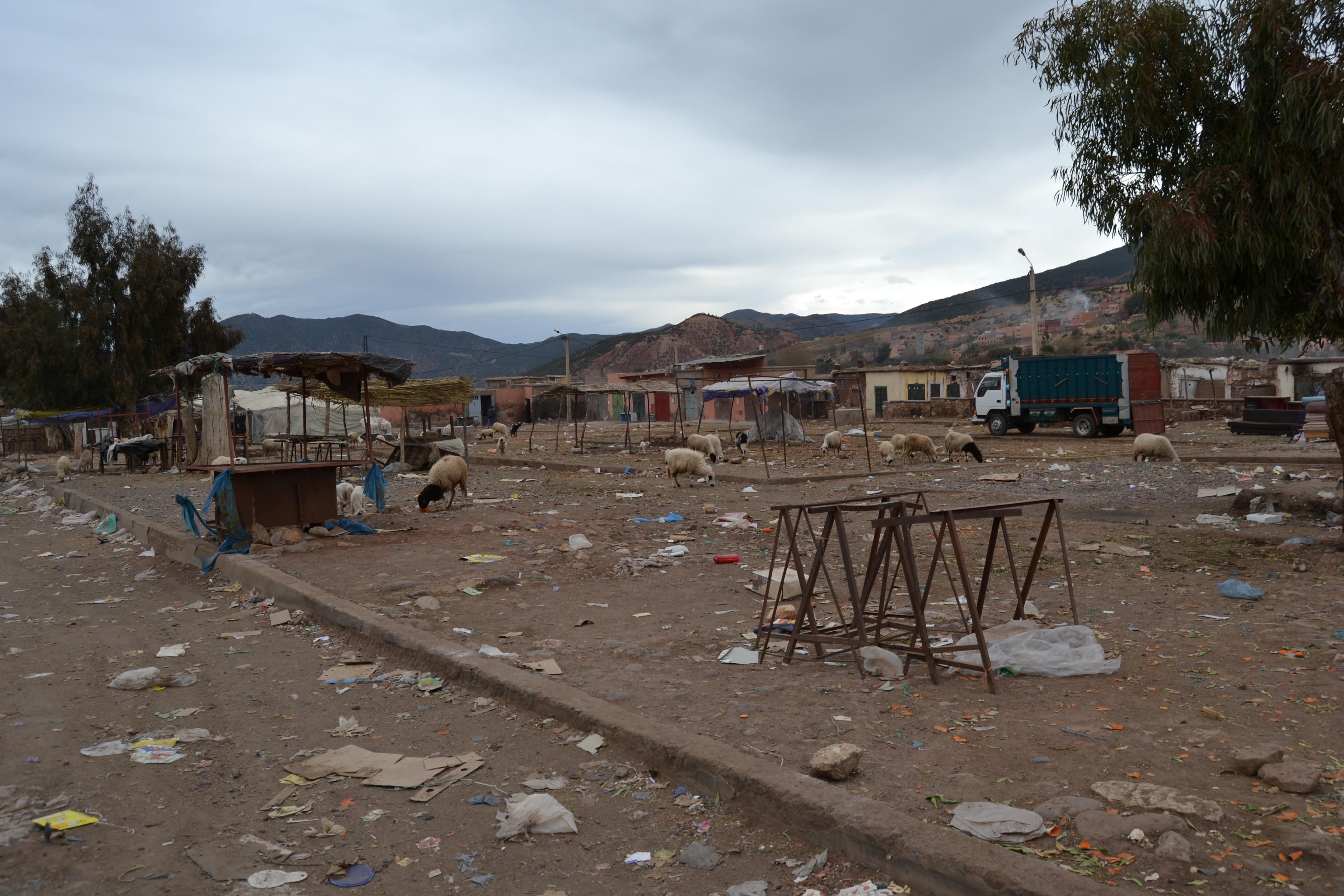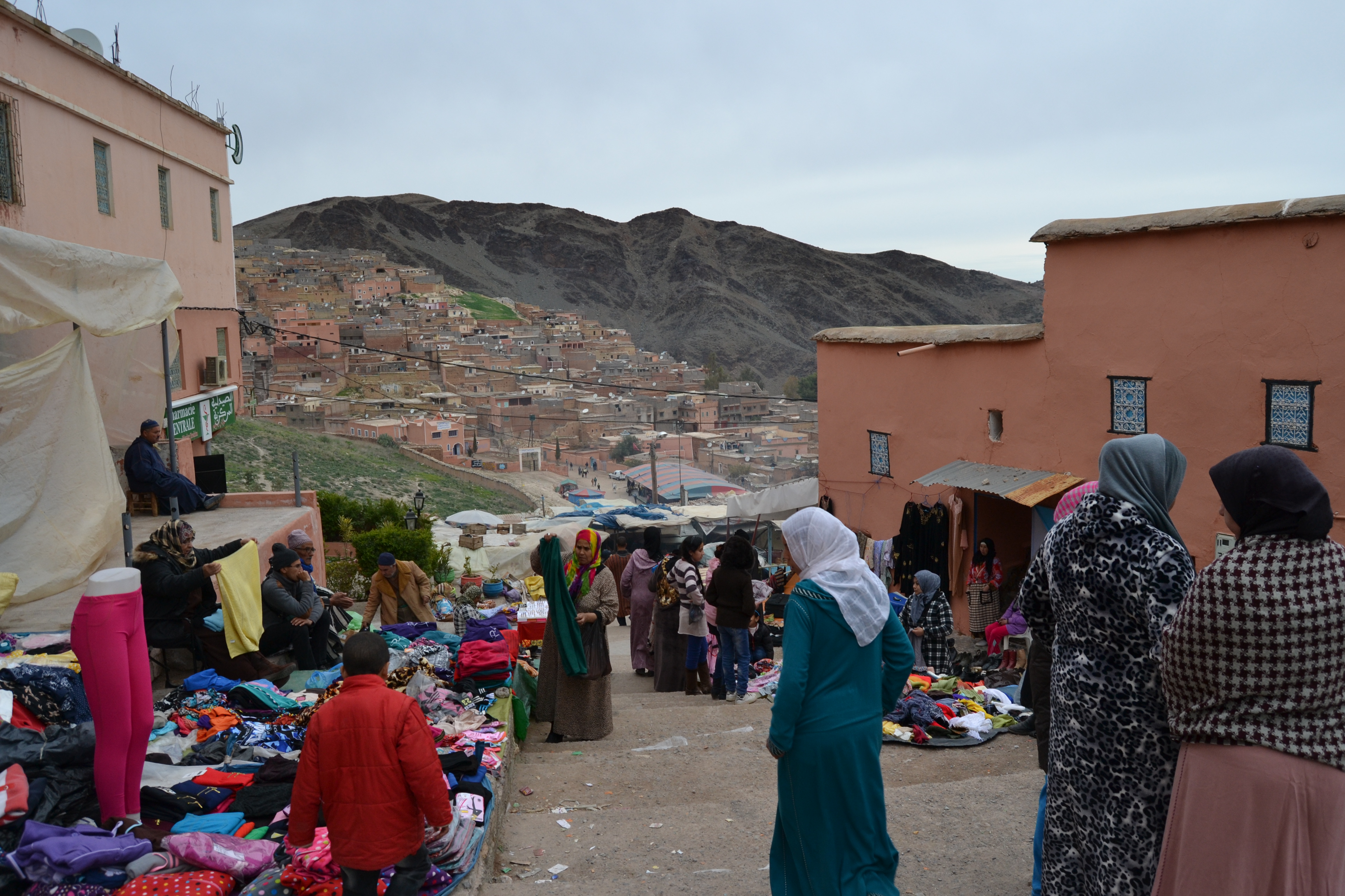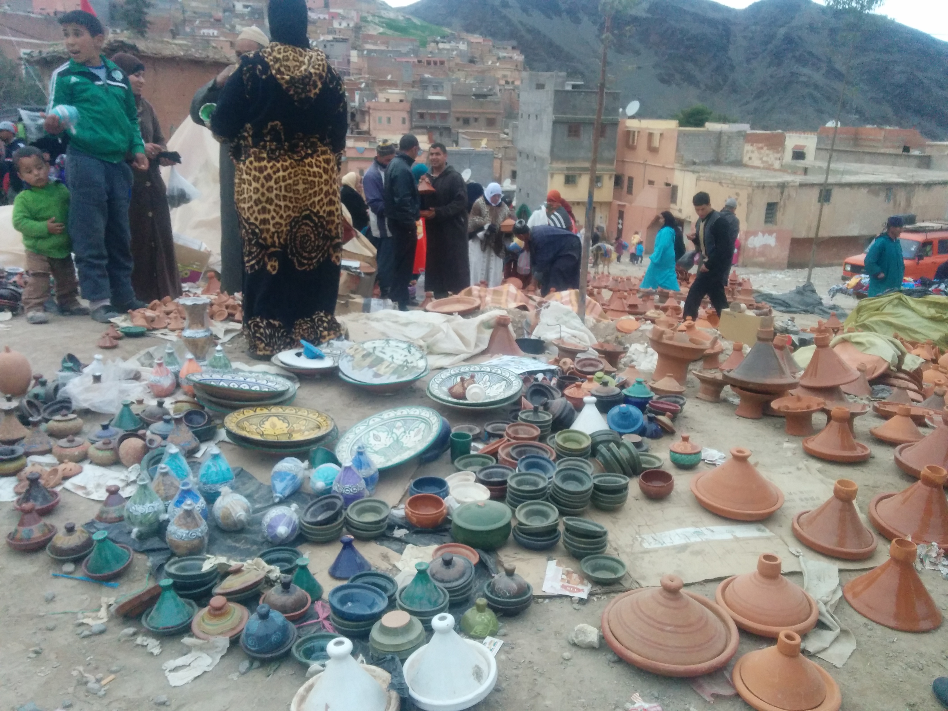 Según andas por el pueblo se ven ovejas, gallinas y demás animales sueltos. De vuelva a Marrakech paramos en Moulay Brahim, donde hay un mercado. Me llama muchísimo la atención que en la carnicería el pollo lo compras vivo para matarlo por el rito halal. También da bastante asquete ver la cabeza de una vaca colgada escurriendo sangre…