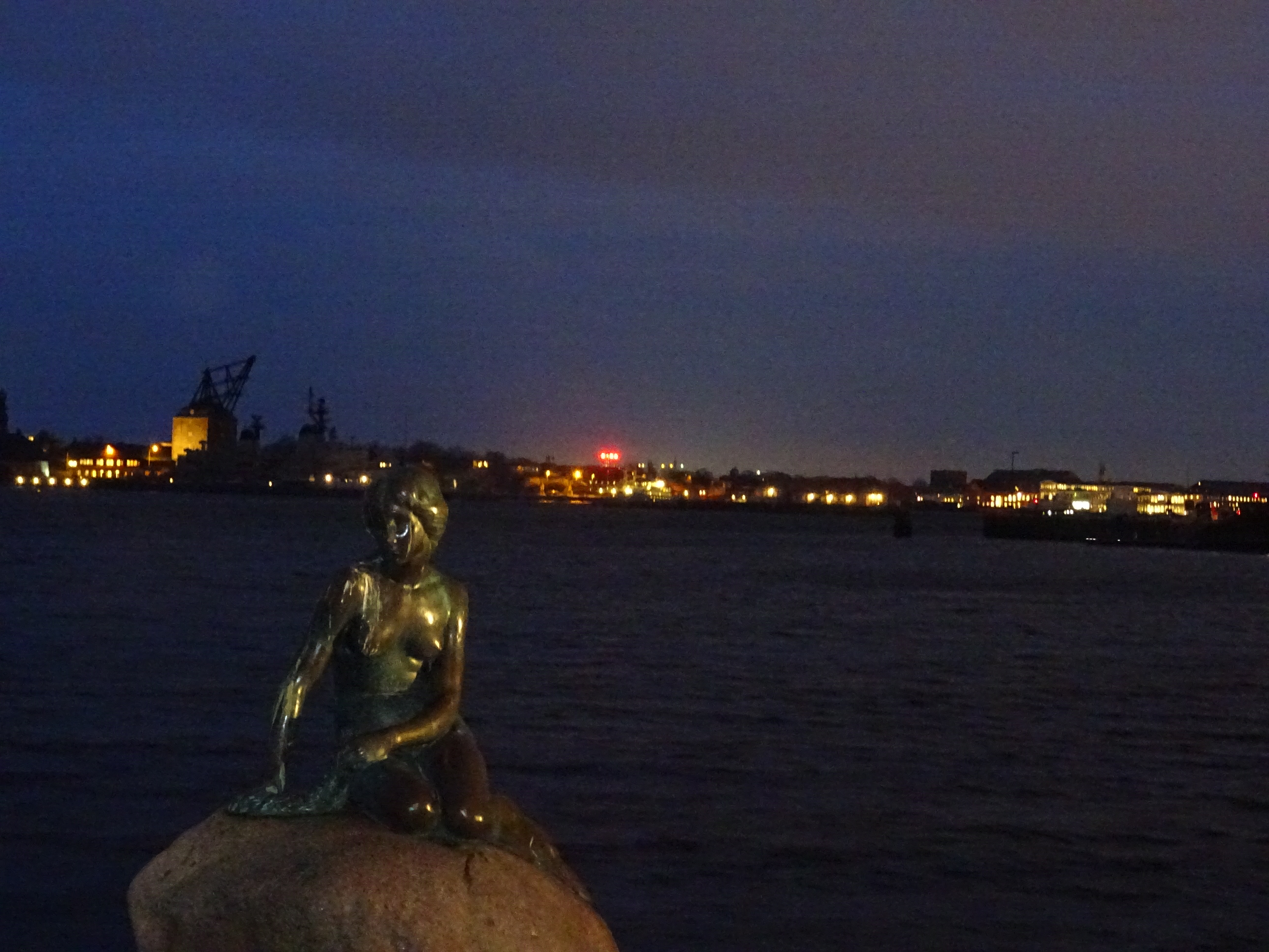 Cuando anocheció, fuimos a ver la famosa sirenita. Ya habíamos leído en varios blogs que es algo muy sobrevalorado, así que con esas expectativas, no nos decepcionó. La estatua en sí no es muy grande y está muy mal iluminada, pero aún así nos tiramos un buen rato haciendo fotos.