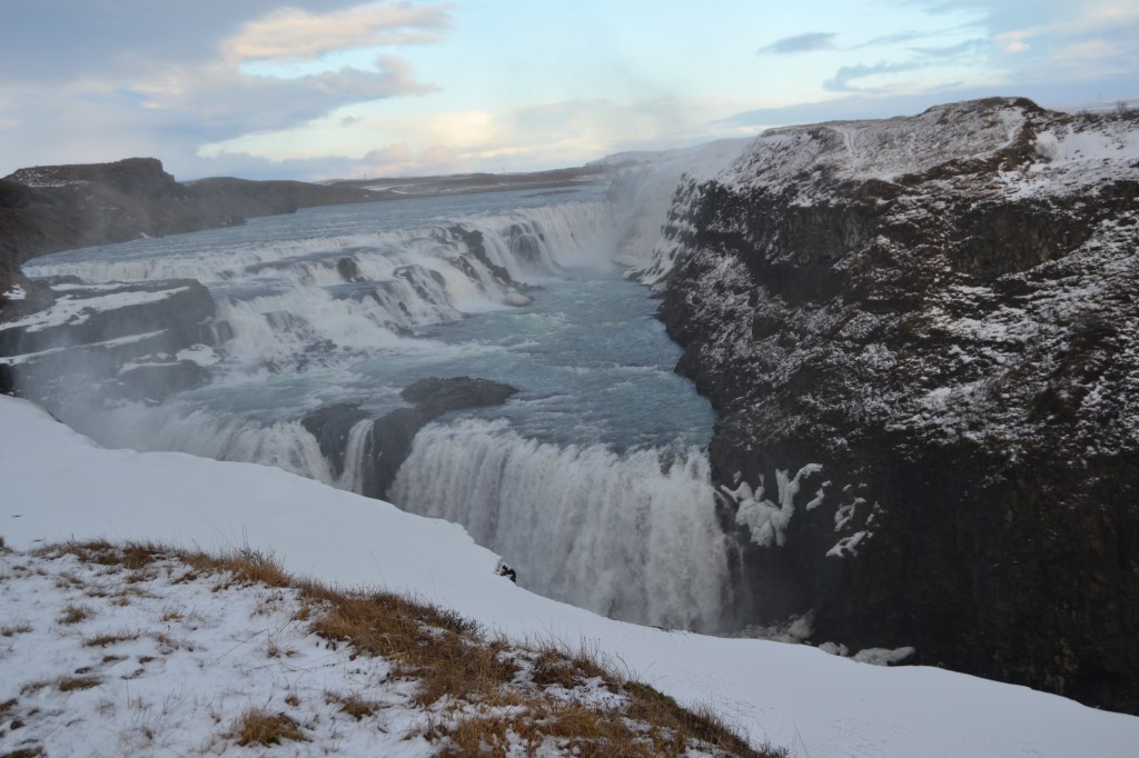 Para terminar la ruta, vamos a Gullfoss, la casada impresionante que sale en las fotos cuando buscas Islandia. Tuvimos la suerte de que al ser febrero no había tantísimo turista y menos que vaya por libre con la nieve.