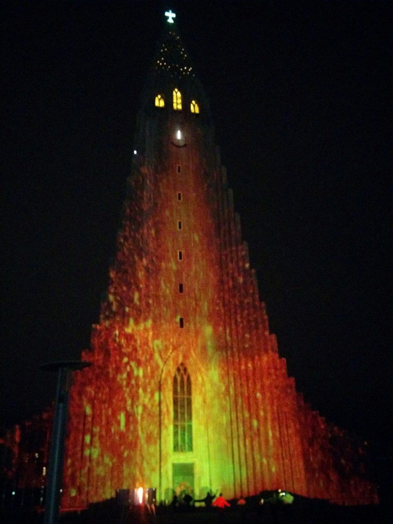 La tarde del primer día la aprovechamos para ver la ciudad, que no tiene gran cosa más allá de la catedral. Allí estaban proyectando un videomapping que simulaba la erupción de un volcán, muy acertado para Islandia.
